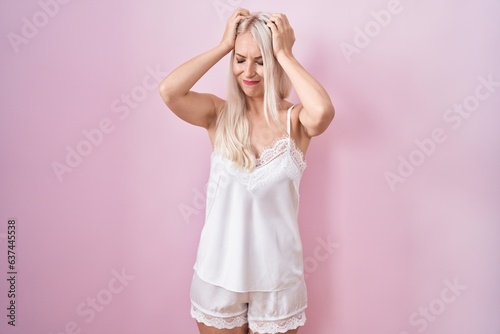 Caucasian woman wearing pajama wearing pink background suffering from headache desperate and stressed because pain and migraine. hands on head.