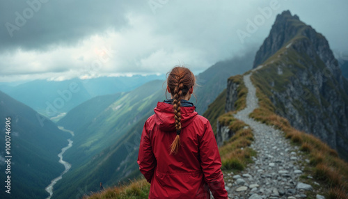 Caucasian woman with braided auburn hair, walking along a narrow ridge at a steep mountain peak, wearing a red waterproof jacket, with dramatic storm clouds gathering in the background, heightening
