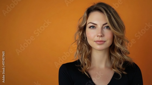 Caucasian woman with long wavy blonde hair posing against orange background in glamorous fashion portrait