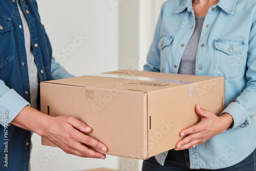Caucasian young adult man handing cardboard box to Caucasian young adult woman, both standing close together, focusing on package exchange, only torsos and hands visible