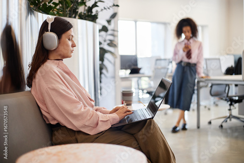 Caucasian young adult woman wearing headphones working on laptop while sitting on bench in modern office, biracial woman standing in background using smartphone near desks