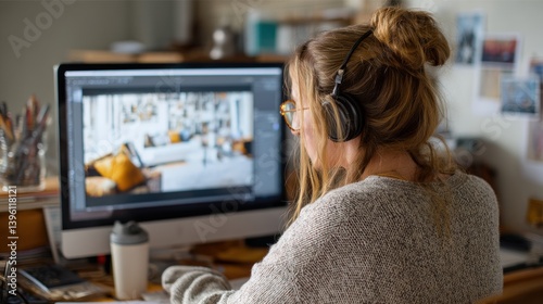 Caucasian young female editing photos on computer with headphones in creative workspace