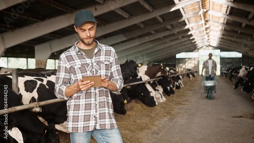 Caucasian young handsome male farmer standing inside barn with cow flock and using tablet device. Mixed-race workers working in shed on background. Cows in stable, livestock concept