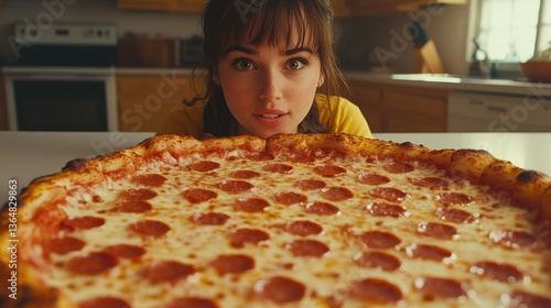 Caucasian young woman excitedly gazing at large pepperoni pizza in kitchen