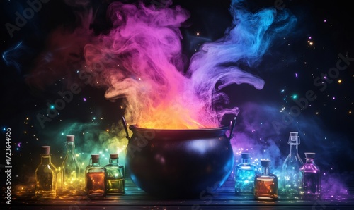 Cauldron bubbling with mystical glowing smoke, surrounded by various bottles and sparks on a dark background