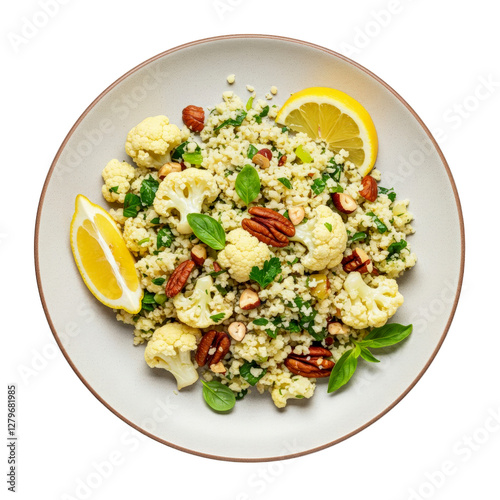 Cauliflower Rice Salad on a plate - cauliflower rice, roasted nuts, herbs, lemon-garlic dressing
