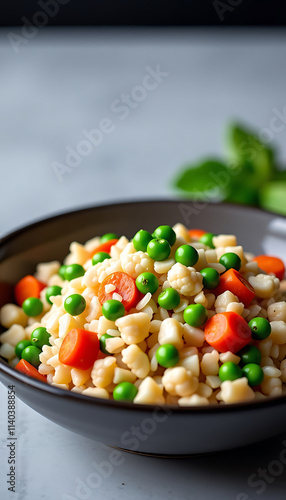 Cauliflower Rice Stir-fry - A quick stir-fry made with cauliflower rice peas and carrots. background copyspace