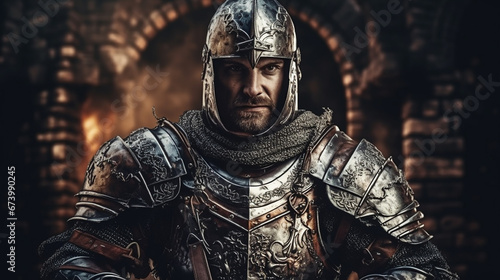 Cavaleiro medieval em armadura e arma em fundo escuro. retrato do cavaleiro