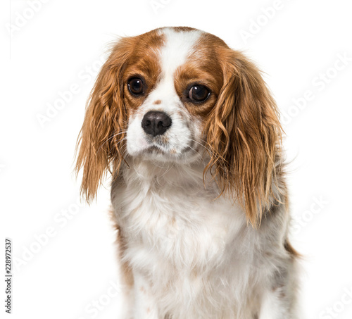 Cavalier King Charles Spaniel, 2 years old, in front of white ba