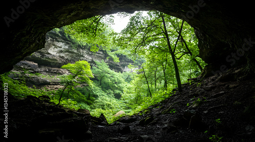Cave Entrance Reveals Lush Green Forest With Bright Sunlight Illuminating Rocks And Vegetation
