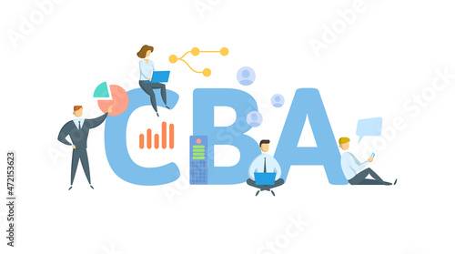 CBA, Cost-benefit Analysis. Concept with keyword, people and icons. Flat vector illustration. Isolated on white.