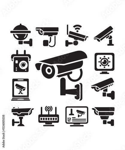 cctv icons, surveillance camera icons set silhouette vector on white background.