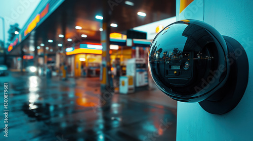 CCTV outdoor, A close-up of a security camera at a gas station, with a blurred background showcasing a rainy atmosphere.