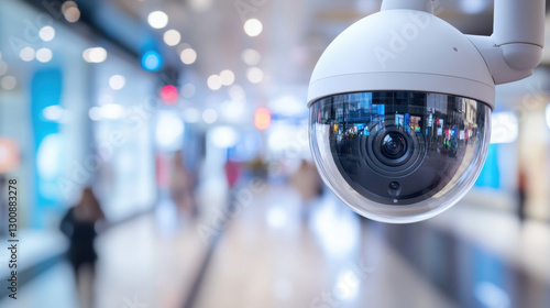 CCTV outdoor, Surveillance camera monitoring a busy retail space with blurred shoppers in the background.