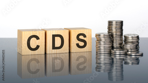 CDS - text on wooden cubes on a cold grey light background with stacks coins