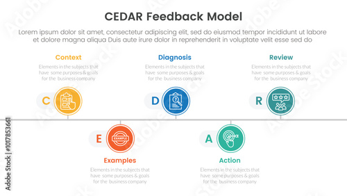 CEDAR feedback model infographic template banner with timeline circle point right direction with circle badge with 5 point list information for slide presentation