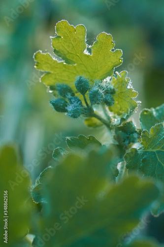 Celandine leaves with dew drops.