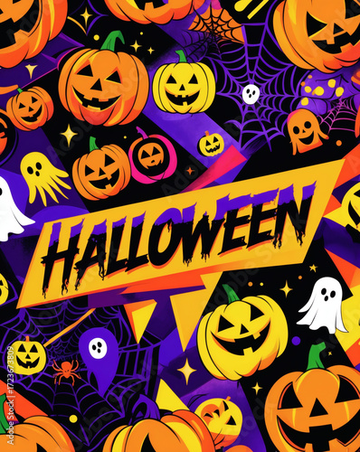 Celebrate Halloween with vibrant pumpkins, playful ghosts, and festive decorations in a colorful design for this spooky season