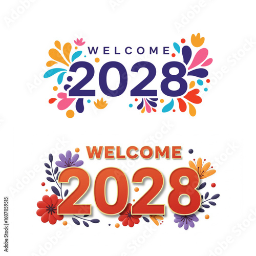 Celebrate new beginnings with vibrant "Welcome 2028" floral designs for festive greetings and modern year-end promotions.