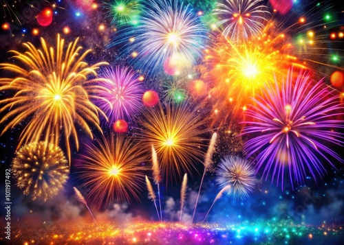 Celebrate the New Year 2023 with a vibrant backdrop of colorful fireworks and sparkling lights that illuminate the night sky in joyous festivities.