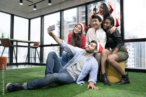 Celebrating New Year together, group of beautiful young people in Santa hats having fun.