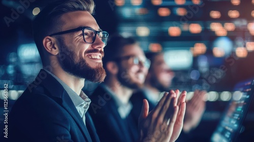 Celebrating success engaged audience applauds at business event in modern venue nighttime atmosphere