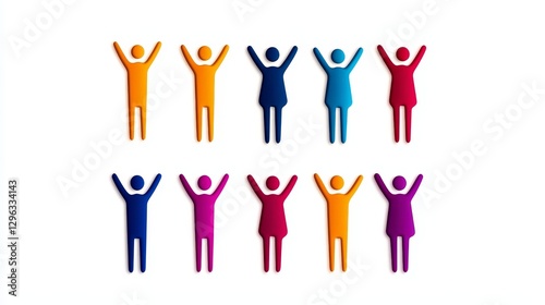 Celebrating Unity: Diverse Figures Rejoicing - Colorful figures with arms raised high, symbolizing unity, diversity, and celebration. Ideal for teamwork, community, and togetherness concepts