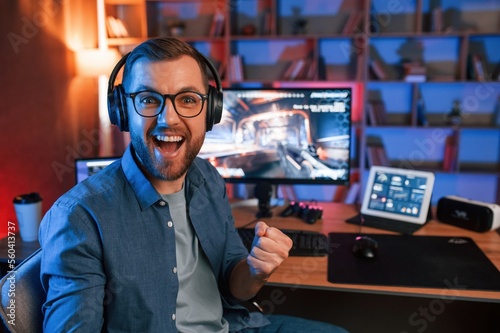 Celebrating victory. Man is playing the shooter game on his computer. Neon lighting