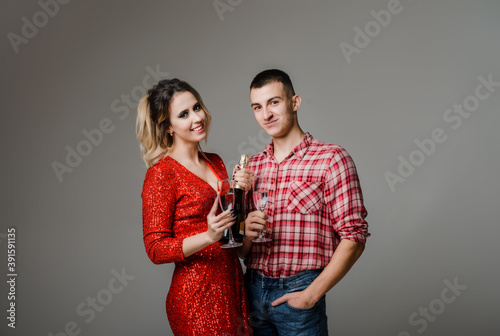 celebration and people concept - happy couple with bottle of champagne and glasses over gray background