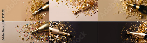 Celebration background with golden champagne bottle, confetti stars and party streamers. Christmas, birthday or wedding concept. Flat lay.