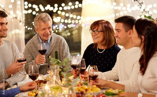 celebration, holidays and people concept - happy family having dinner party, drinking red wine and toasting at home