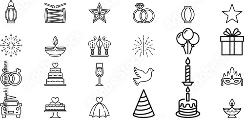 Celebration icons including wedding rings cake and fireworks