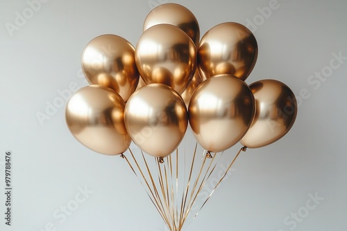 celebration in gold cluster of shiny gold balloons floats against pure white backdrop various sizes create depth reflection adds glamour perfect for festive occasions milestones