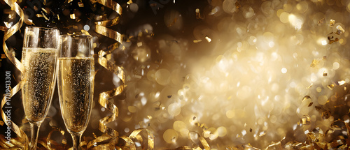 Celebration with champagne glasses and golden confetti in a festive background during New Year's Eve