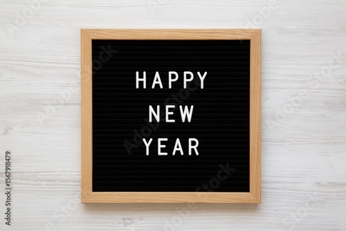 Celebratory New Year message displayed on contemporary sign against a white wooden backdrop, top-down perspective, flat lay, overhead view with ample space for text.