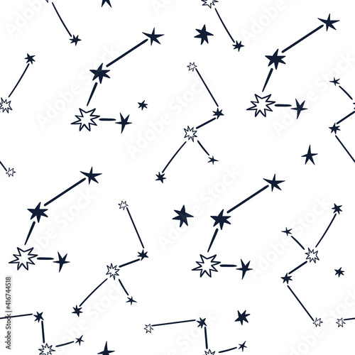 Celestial black and white stars seamless pattern - hand drawn line space digital paper with constellations, cute kids starry seamless background for textile, scrapbooking, wrapping paper