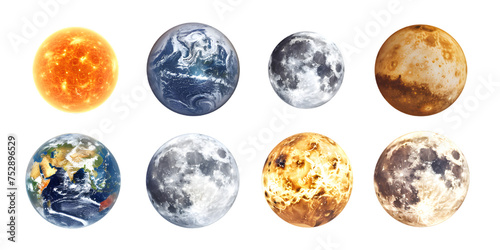 Celestial body collection, sun, planet earth, moon, mars and saturn, isolated on a white or transparent background