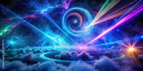 Celestial Convergence Vibrant Nebulae, Energetic Beams, and Swirling Cosmic Rings Above a Dreamlike Cloudscape