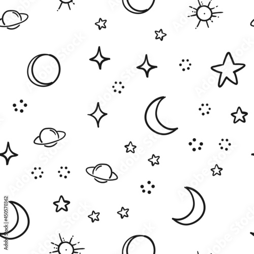 Celestial doodles seamless pattern. Hand drawn stars, planets and moons background texture.