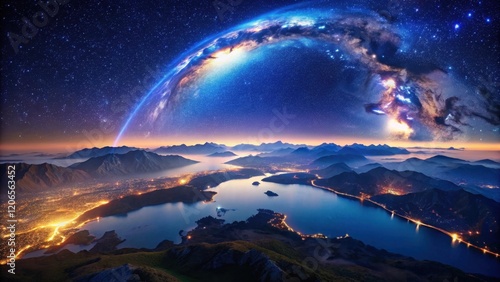 Celestial Embrace Night Lights Gleam Beneath a Starry Arch Over a Serene Mountain Lake