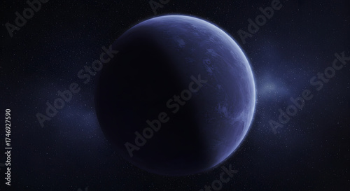 Celestial Enigma: A captivating, cold, and serene view of a solitary planet suspended in the vast cosmic expanse, with a sense of mystery.