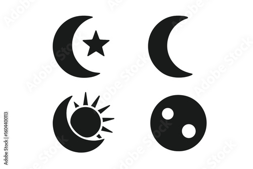 Celestial icon set featuring moon, sun, and star symbols. Minimalist black silhouette vector collection for astronomy and astrology. Includes crescent moon, solar eclipse, and planet.