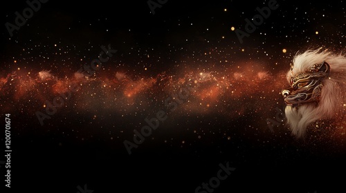 Celestial Lion Dance Mask Against Cosmic Nebula