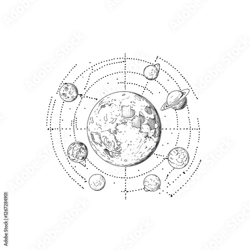 Celestial Mechanics Earth and Planets in Orbits - Hand-Drawn Sketch