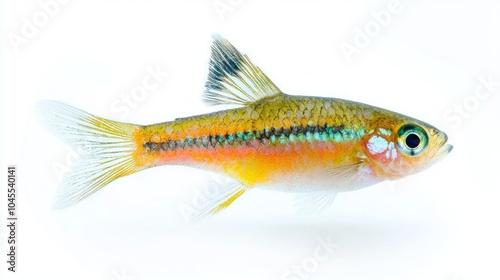 Celestial Pearl Danio displays its vibrant colors as it swims in a still environment. This fishs intricate patterns captivate viewers highlighting its natural beauty.