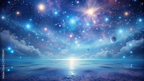 Celestial Seascape An Ethereal Ocean Meets a Starry Sky Filled with Planets and Glimmering Lights