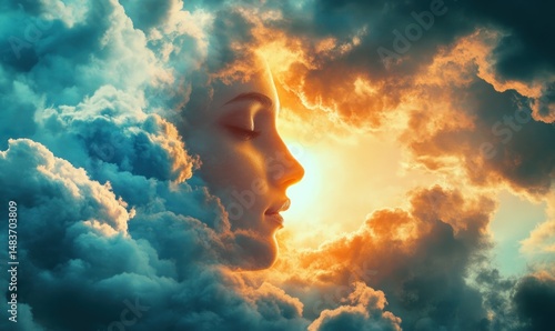 Celestial Serene: A Woman's Face Emerges from a Dreamlike Cloudscape