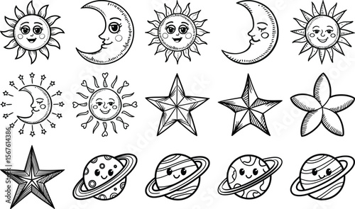 Celestial Sun Moon Star Planet Line 16 Design Elements