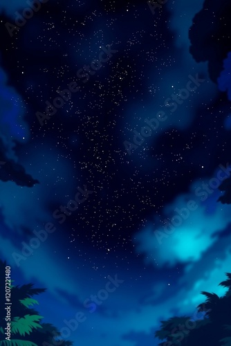 Celestial Tapestry: A breathtaking view of a starry night sky, with countless twinkling stars scattered across a canvas of deep blue clouds. The scene evokes a sense of wonder, mystery.