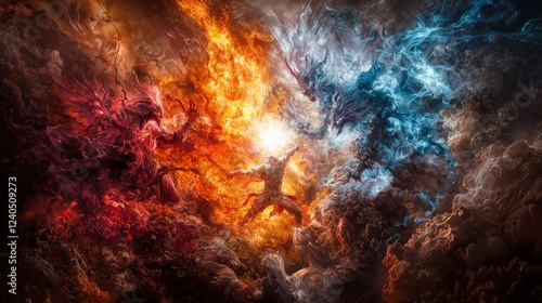 Celestial warrior battles demons in alternate dimension epic fantasy art dramatic clouds surreal environment
